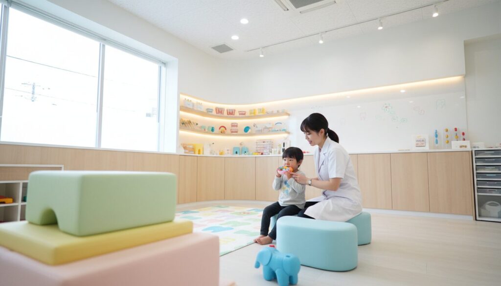 当院では、小児矯正専用のトレーニング環境を整え、遊びながら楽しく口腔機能を鍛えられるアクティビティルームを完備しています。