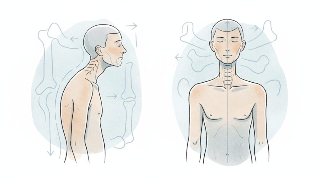 咬み合わせが悪いと、顎の位置がずれて頭部のバランスが崩れます。頭部は体重の約10%を占める重い部位であり、そのバランスが崩れると首や肩、背骨に負担がかかります。